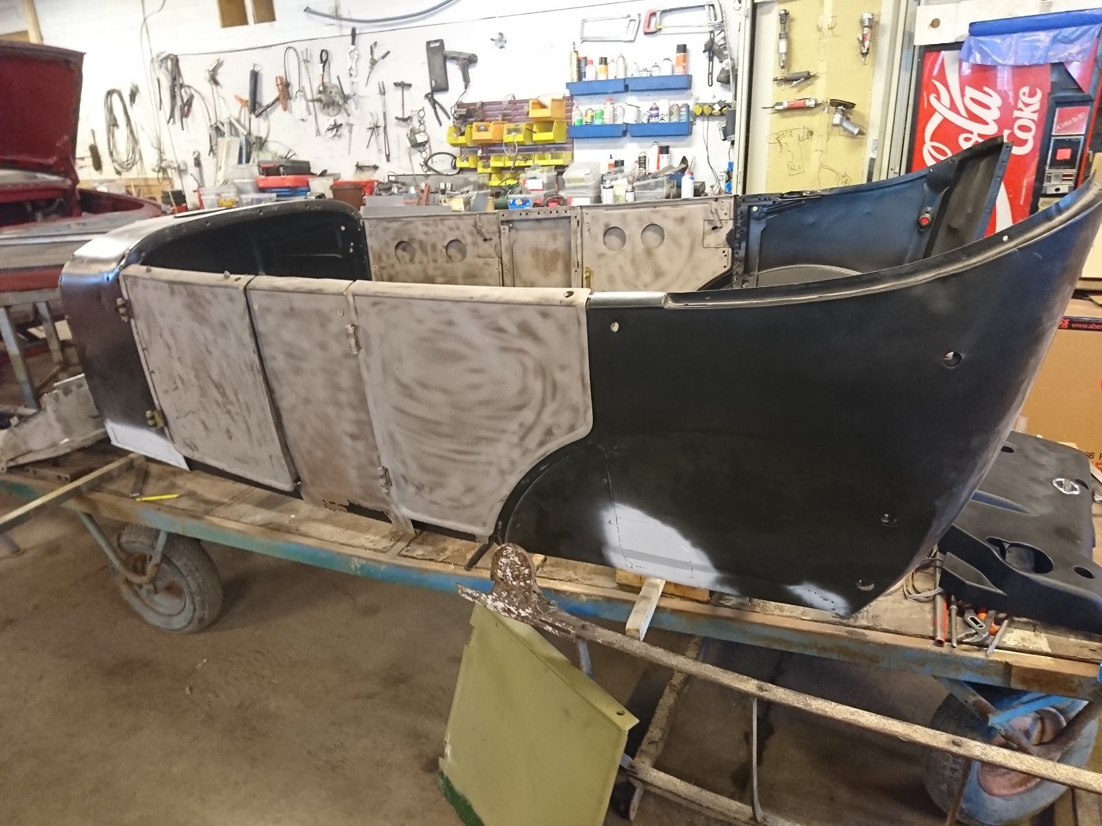 After my '26 body was postponed slightly by the workshop due to other projects, it is now full ahead again. The goal is to have the whole body temprarily assembled but all bodyparts, fenders, windshield frame, running boards etc. to have been sandblasted and black epoxy coated to the fair "Trøndermarkedet" 16th of June and to the car show "Motormessa" 22nd of June.