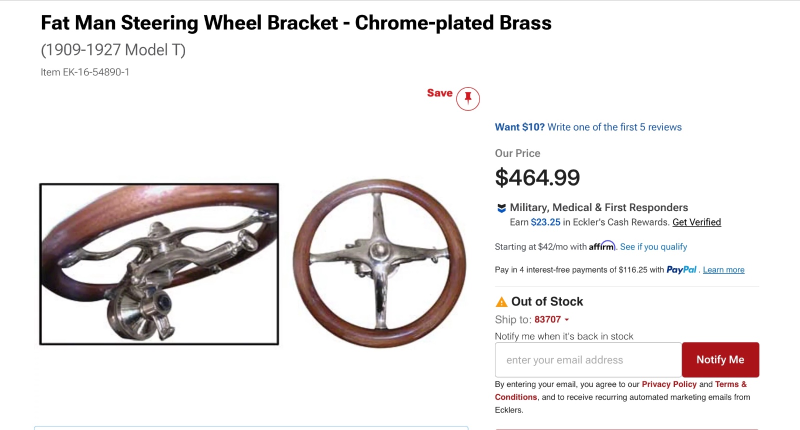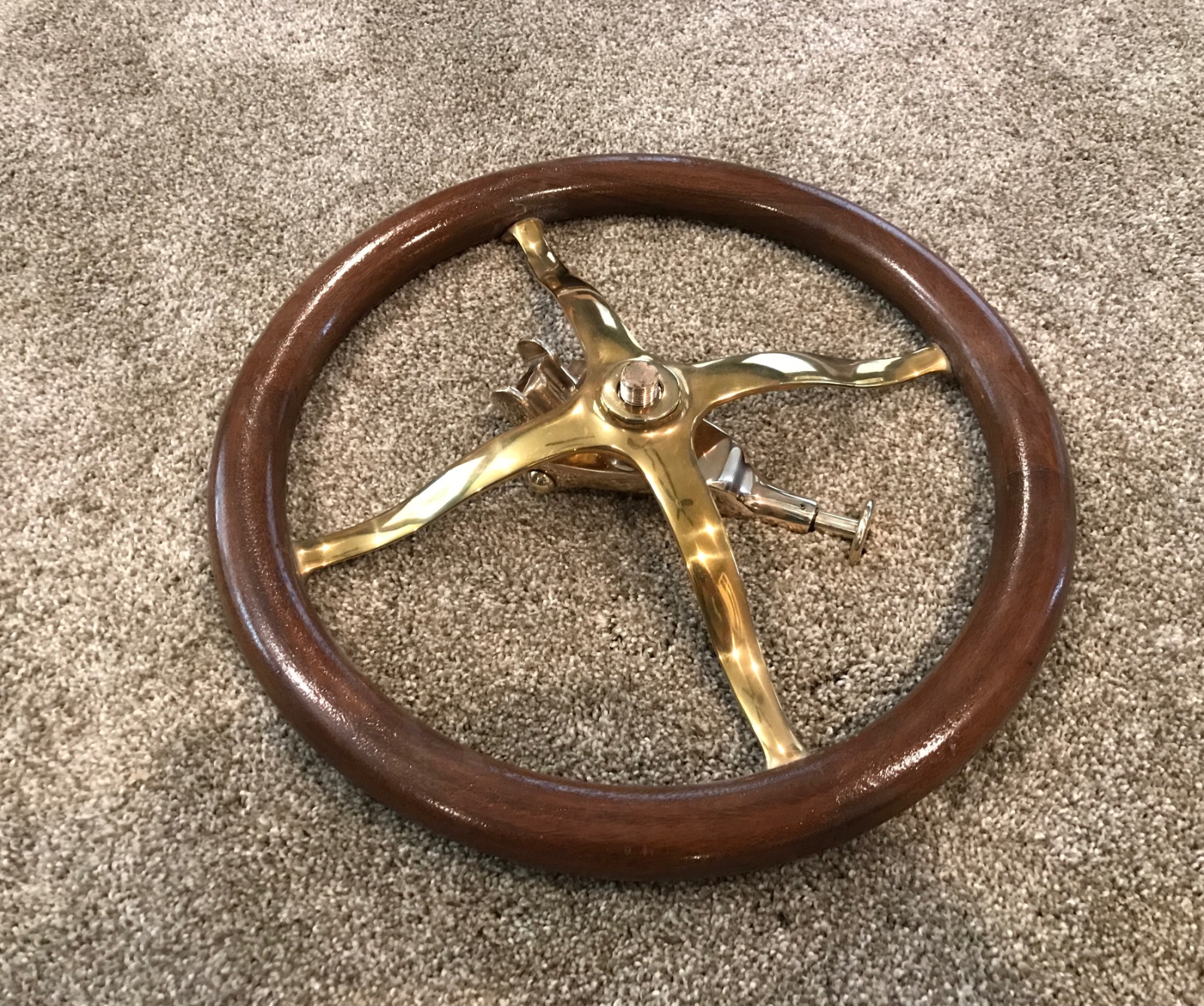This heavy duty polished brass (not chrome) pivoting fatman bracket attaches to your T steering wheel, and then to steering wheel shaft.There is a brass knob that you pull that releases the steering wheel and allows it to pivot vertically out of the way. Very solid, no unnecessary movement with an internal spring loaded catch when raised. Very nice solid brass construction. No longer being made or sold, now discontinued. Originally sold for over 400 from the venders. Excellent condition, very well made from solid heavy brass, new condition. Steering wheel for demonstration only, not included. 325 includes shipping.