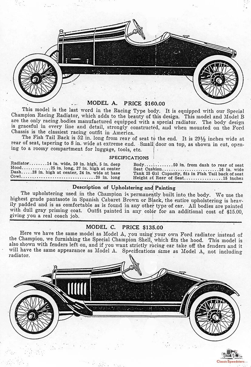 To my eye, it looks to be a closer match to the Model "C' in the advertisement. The louvered hood and the cowl to hood transition angle are very similar to the drawing. The car in the photo looks to have taken the suggestion in the advert to remove the stock Ford fenders, running boards and splash aprons, but it still appears to be running the stock Ford radiator as described in the advert copy for the "C" version.