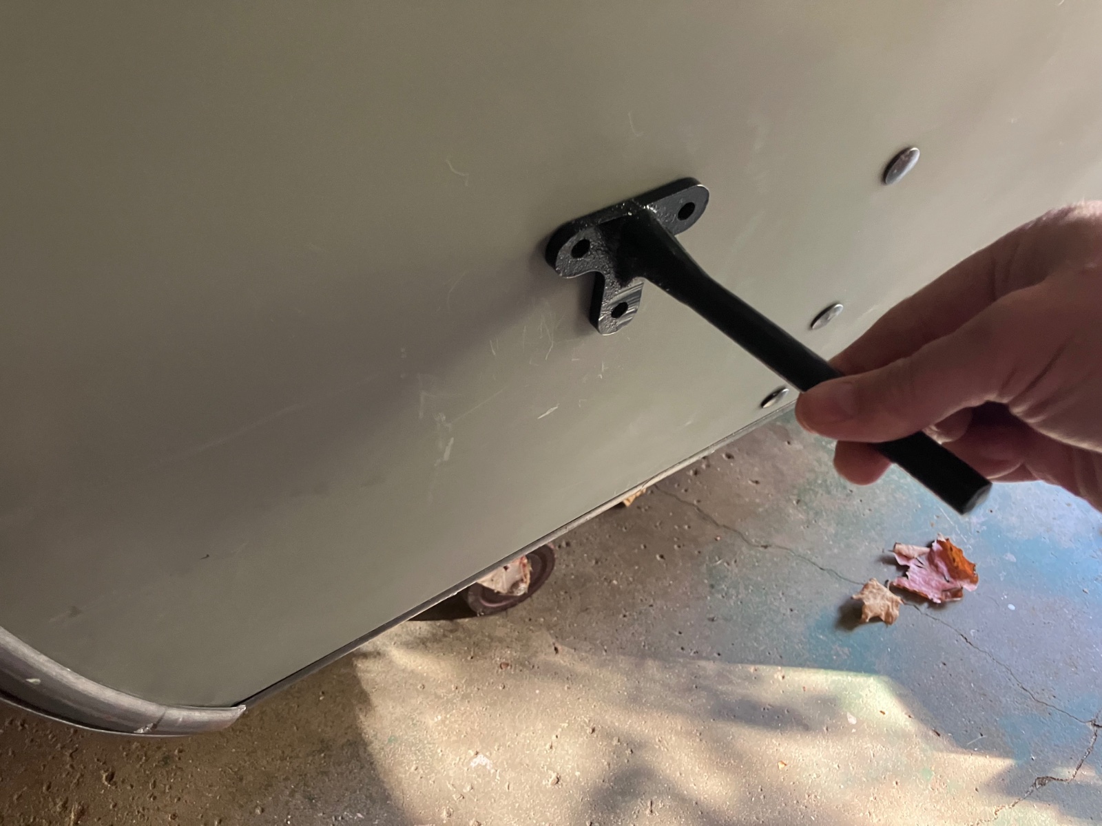 1) You need the eyebolt fender latch riveted in the usual location, and then the easiest from there is to take a piece of all thread...lots of nuts...and simply poke a hole in the Hack body and add all thread using double nuts as lock-nuts, and let the eye bolt cinch the end. (You could also get a piece of 1/2" rod, have one end threaded for about 3 inches and accomplish the same.