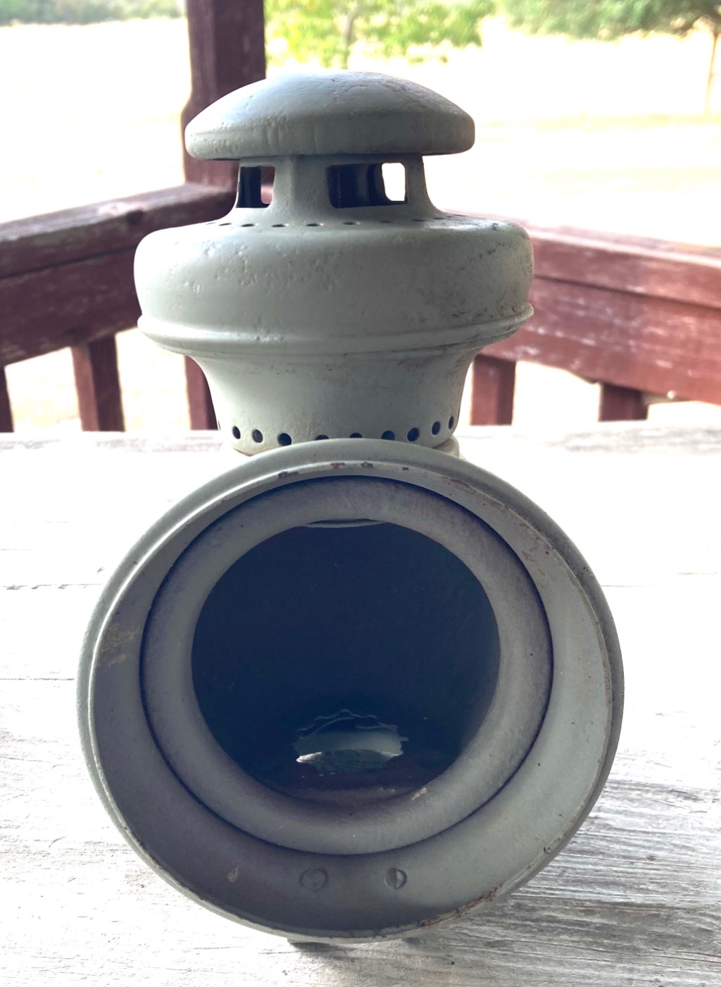 …. see the correct ‘diving helmet’ reflector and vent holes at base of chimney. In excellent shape. Steel chimney top makes it a ‘16 but replace it w/ brass for a ‘15. Sandblasted and in primer. For inexpensive ‘restore’, simply mask hamp and paint reflector with Krylon chrome. Only $40 + shipping.