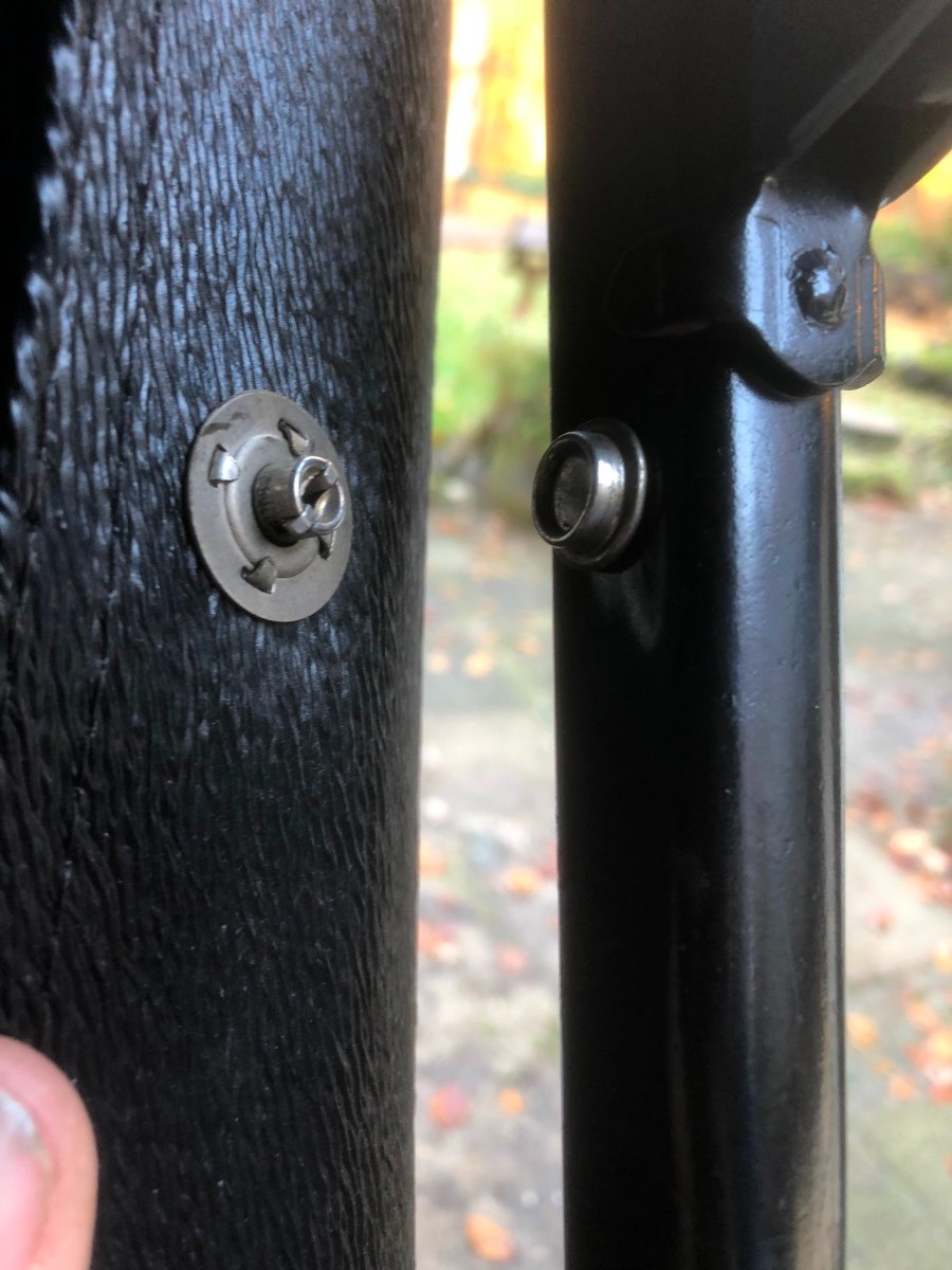 Here is the fastener. In the closed position, you can see the area that the side curtain would occupy. If you need the "male" fastener, Mike at Classtique sells them. The first one with the ring requires a special tool for installation which he also sells. If you use the prong type, you don't need the special tool.