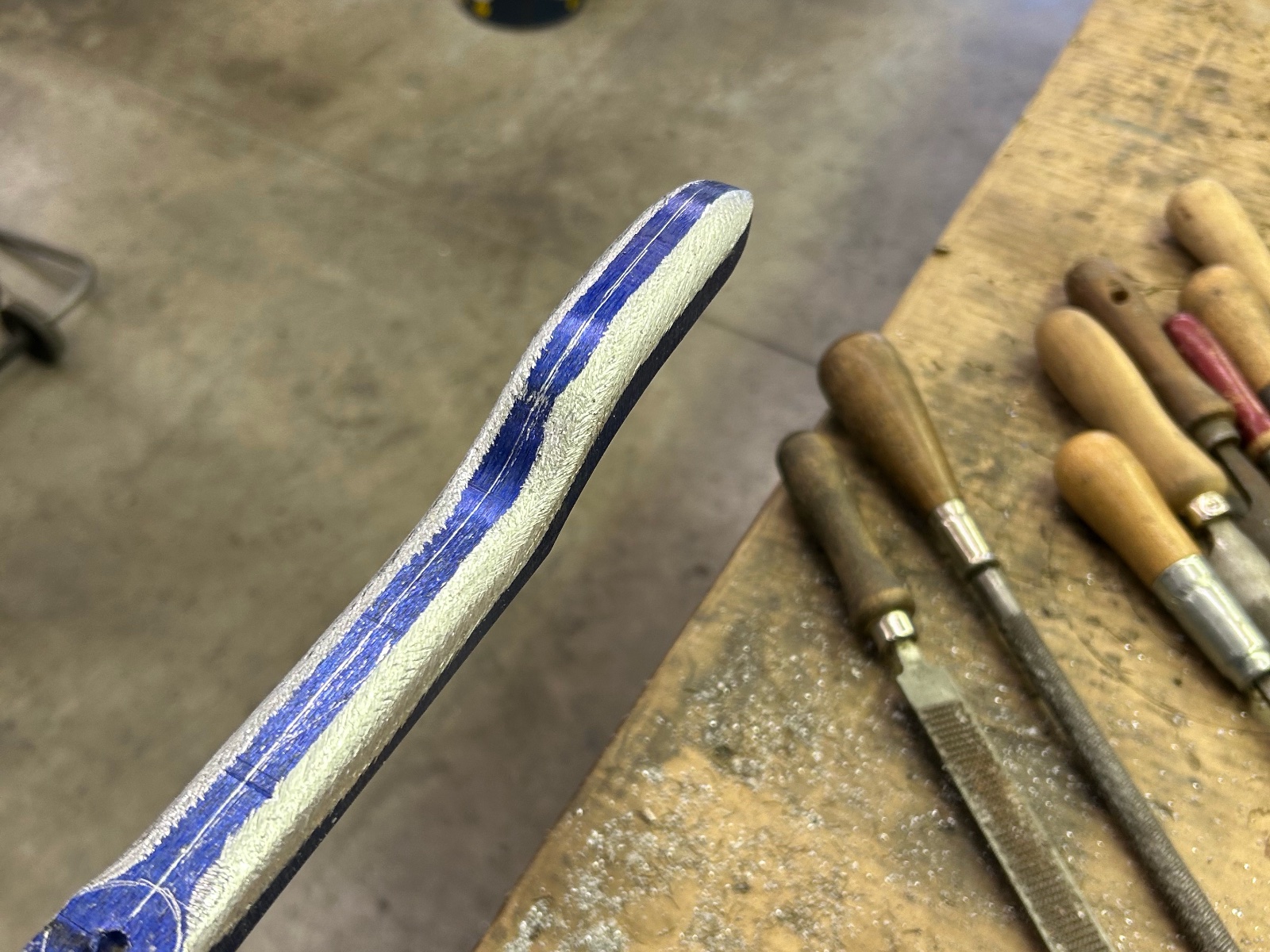 The key in a good job is quality material, T6061 billet, good files and rasp. When ever you are working any soft material use canners wax by means of rubbing your file. They never plug and clean up easy. Watch your pressure when cutting on the strokes. I use lay out dye for a good contrast.