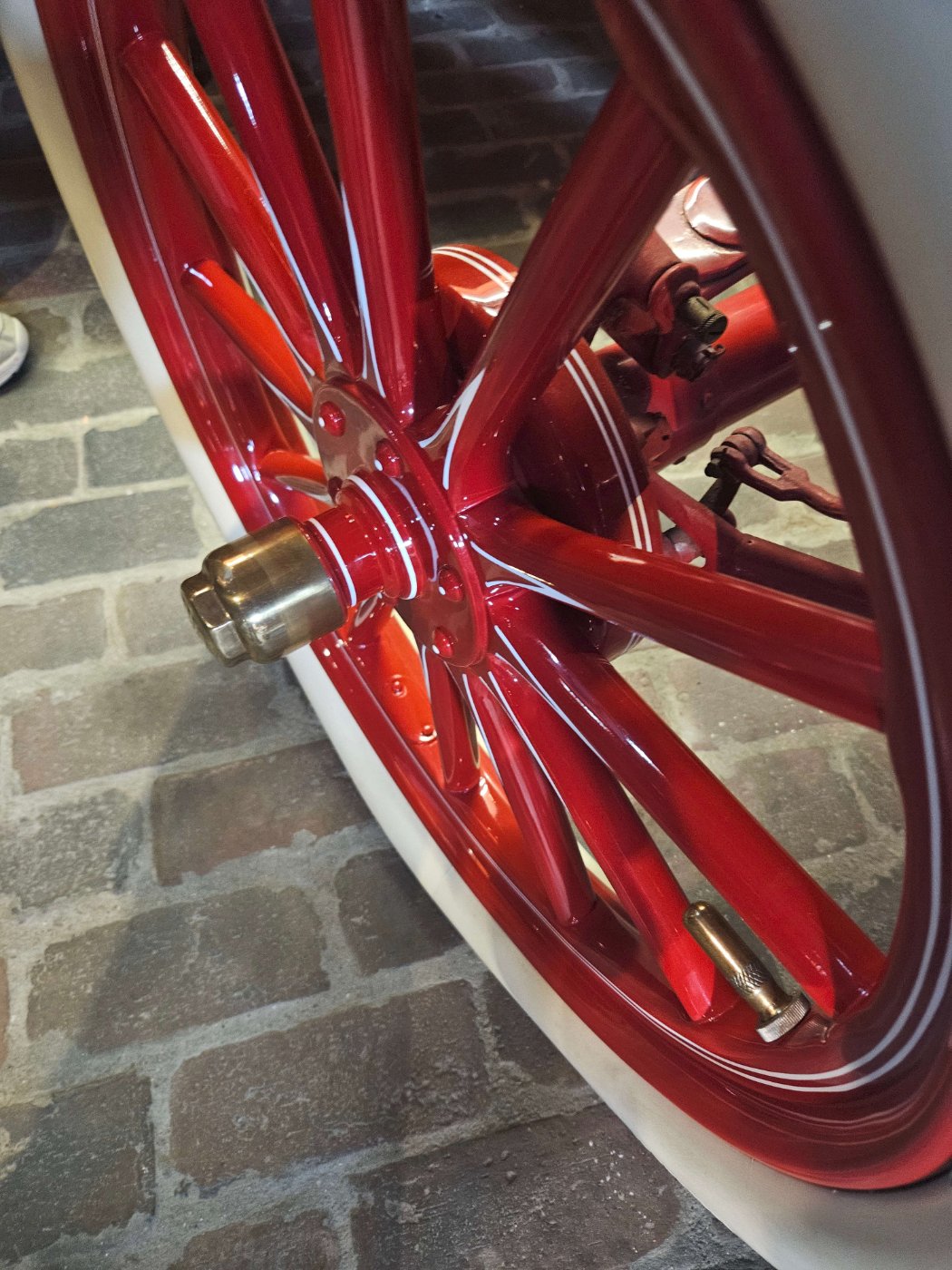 In the loft of one of the many buildings at the Gilmore is Model T Ford serial number 131. This is a two lever, water pump equipped Model T, one of the earliest known to exist today. The tires are covered by vinyl covers intended to reduce the graying effect of sunlight on the tires. Note the linoleum covered wooden running boards with brass edge trim, a feature discontinued after the first 2499 Model T’s. The rear body brackets on the first 2499 Model T’s had four bolts as seen here and the fragile “no rivet” 1909 rear axle assembly as used on the first 10,000 cars. Notice there is not a pinion bearing housing, the driveshaft was supported at each end by a babbitt bushing. The car was purchased with no options, and remains that way today. As such it does not have headlamps, a windshield, or a top. Controls in the first 700 Model T’s consisted of two pedals, two levers, the mixture control, steering wheel, spark and gas levers.