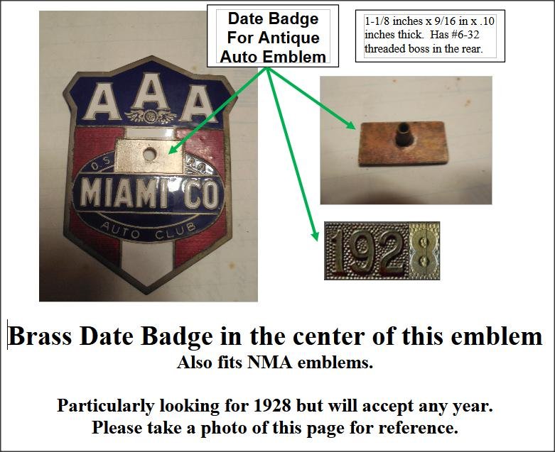 Hi, I am looking for the brass date badge that holds a AAA emblem or an NMA emblem (National Motorists Association) to the radiator.