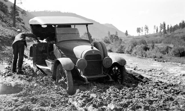 In case you didn't already know, that large touring car stuck in the mire in the photo above is a late teens-early 20s Hudson. The white triangle on the radiator shell gives it away.