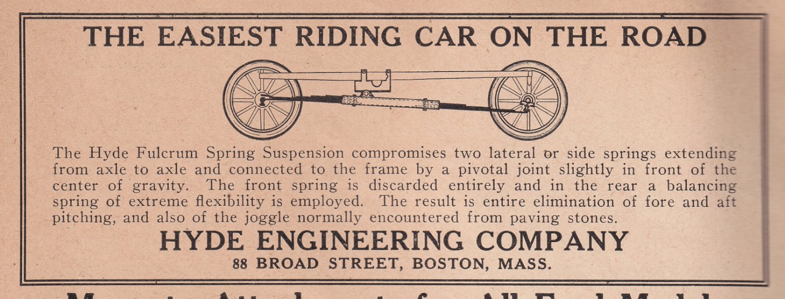 The Hyde outfit probably cost as much as a new Ford, and it apparently lacked any kind of damping, other than interleaf friction. Springs alone, no matter how elaborate, can't give good ride and handling on bad roads at anything much over walking speed.