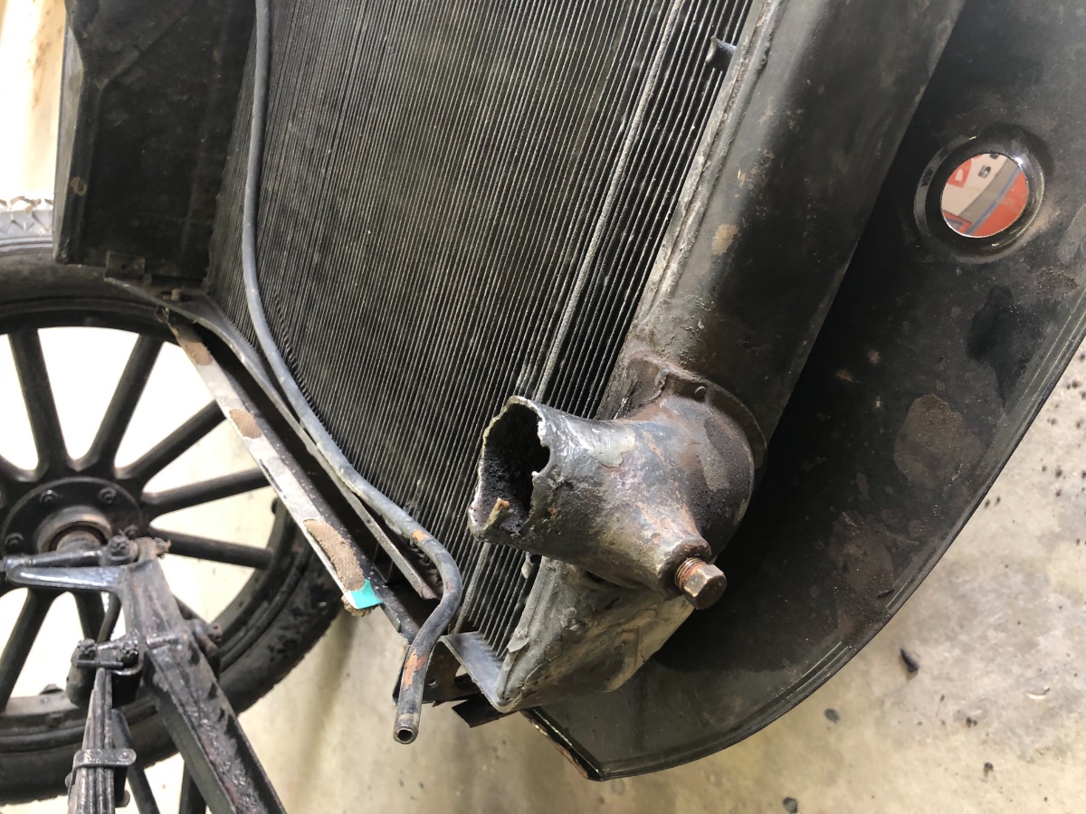 I think brassworks makes a replacement lower radiator outlet. Before I finally bought a new Bergs radiator for my 24 Coupe I repaired the lower outlet with JB weld that was in similar shape as yours. The outlet has to be thourghly cleaned. It lasted for a couple of years or so. If your careful you can reform the bent piece on yours and the use the JB weld. It’s a patch job but it will work. Using a thin piece of tubing on the inside will help.
