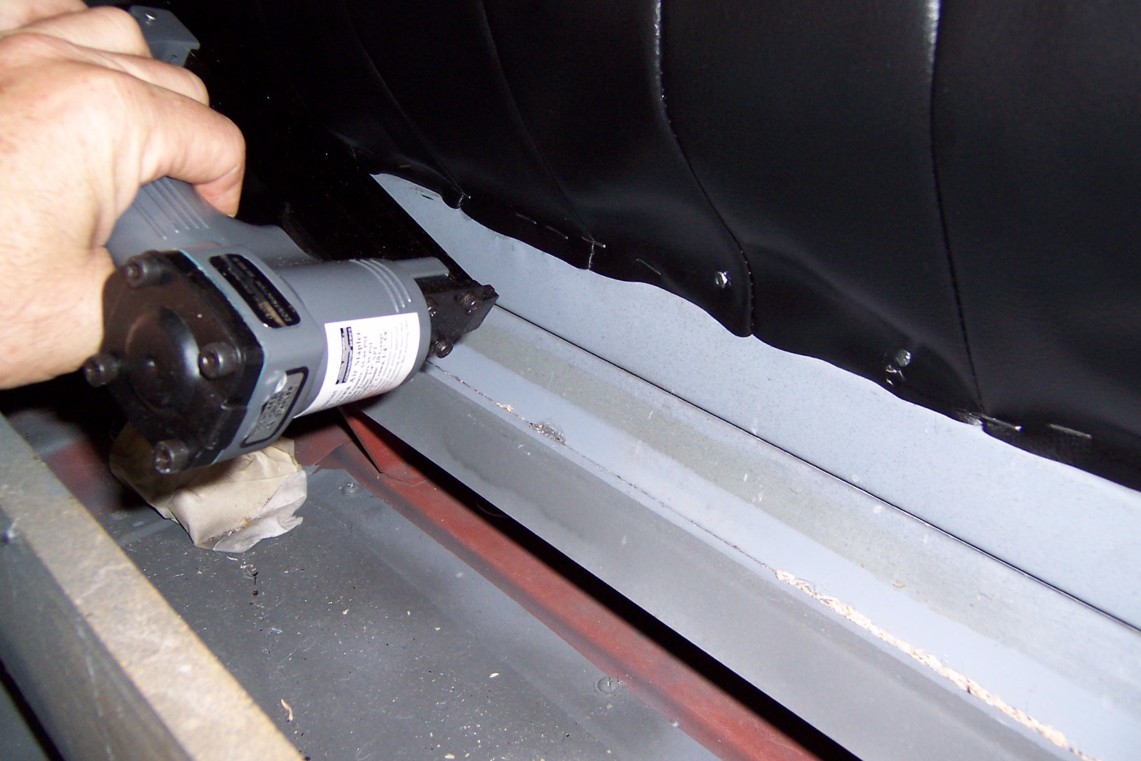 The hip pads go in first. Then the backrest lays down, tack the upper first, pull taut over the backrest springs, and tack to the wood tack strip at the base.