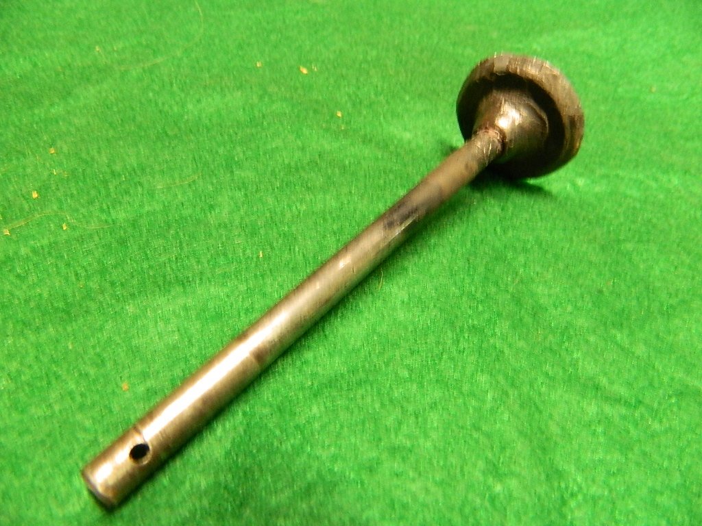This is the one I removed last spring. It stretched on me and would not seat at all, I now have another that I believe has done the same thing, no compression on number 3 cylinder. When I say stretched I think the valve is in it's last days and is about to blow it's top and it starts to separate the stem from the head resulting in the loss of any gap that was between the valve stem and the lifter thus not letting the valve close fully. The turning you see is from me trying to face off the top to see if I could get it apart, it was to hard near center to cut with high speed tool. Jim