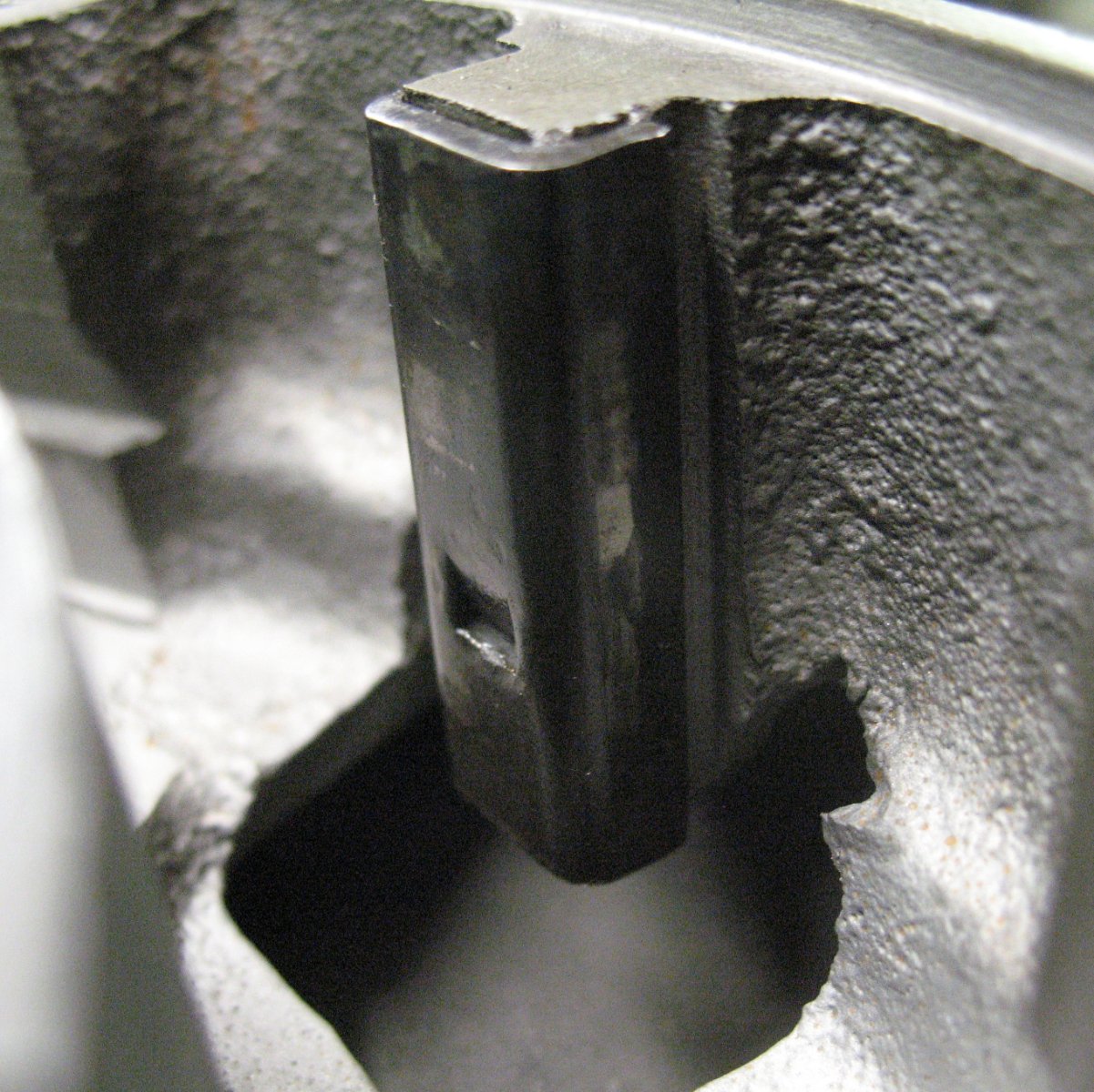 Excessive cam shaft end play revealed that this hole in the bearing is oversized.