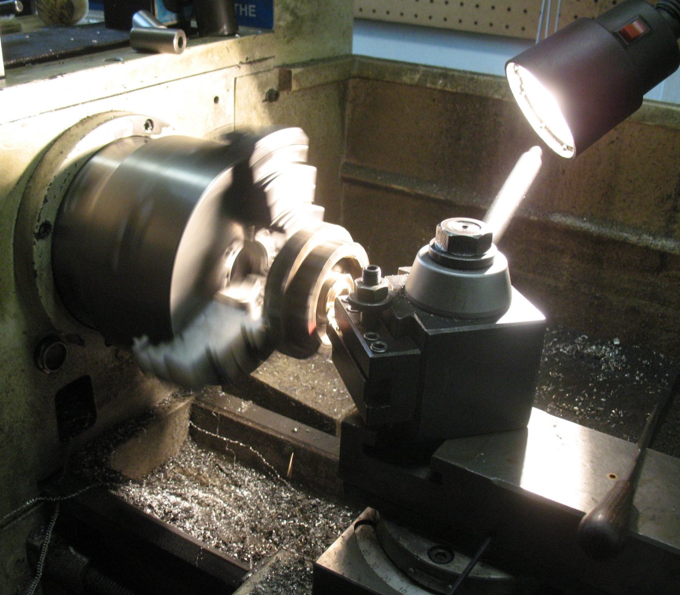 The main shaft was a mighty tight fit, so it went in the lathe for a little shave.