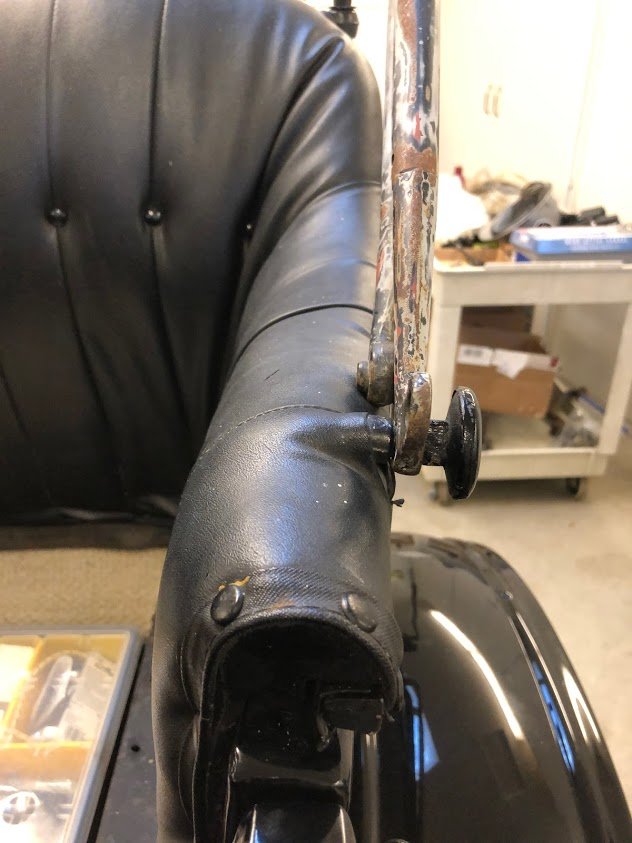 Well it seems that the top bracket is anchored thru the tack strip with the two carriage bolts and then the armrest goes over the tack strip and is screwed down to the top strip to secure it. The wood was completely gone in the body I restored and remembering back it was a head scratcher thinking how the tack strip would be strong enough to hold the bracket secure enough. But adding the armrest, and the wood frame piece seems to make it pretty secure.