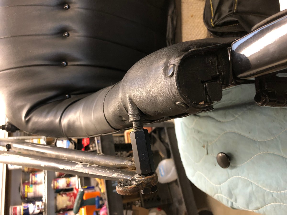 Scott - not sure what you mean by sockets reversed. The two are attached together and while I understand someone could have changed them, the two rear bows "nest" correctly when stacked. From new pictures that just came in I see that the bracket should be straight and not bent like mine but I think even with straightening and letting in the bracket a 1/4" or so into the wood, I'm not going to get that 1" protrusion I'm looking for since the point I'm starting with the threaded portion is right at the tack rail. From there I need to gain a whole inch. Your pictures are great. That tack strip is killing me. That's why John Saylor's thought that there may be a different bracket for the wider armrest makes sense but neither of us have any info.