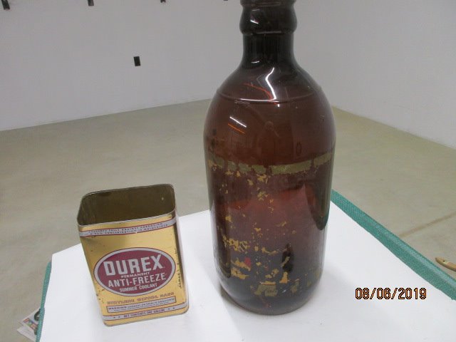 Well, the suppliers of Happy Sally improved their containers over the years to keep up with popular trends. Cliff Toshover, a world renowned bottle collector, displays 4 from his collection here. The bottle at far left was blown in a hinged mold leaving a vertical seam. With the long neck it may be the type in the recent photo.