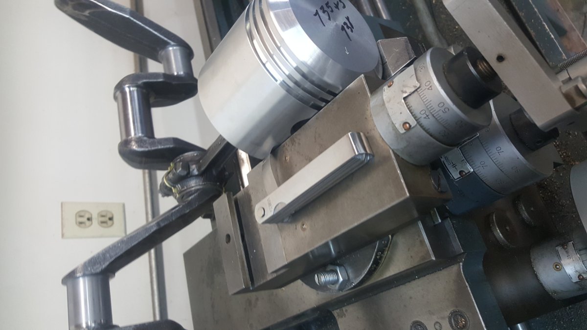 Allan, a check on things is accomplished by moving the carriage to where the piston rests against the other side of the cross slide. Since the cross slide is perpendicular to the bed and both sides are parallel, placing the piston on the other side confirms the reading you got initially. I prefer to keep the rod in the same position it will run in the car as opposed to reversing the rod on the crank. The methodology is no different than using a fixture with a stub ito mount the rod and a vertical plate against which the piston is checked.