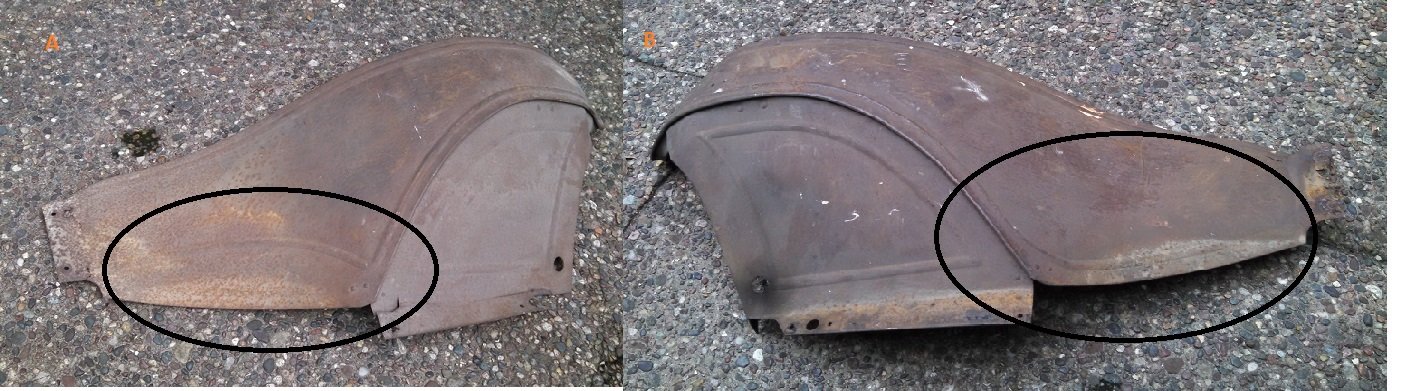I had these fenders since 1973 (purchased from Norm Miller in Davenport Iowa) and sold them last year. I thought they would spark some interesting discussion. Fender A is a left front and B is a right front in both sets of photos. So...................