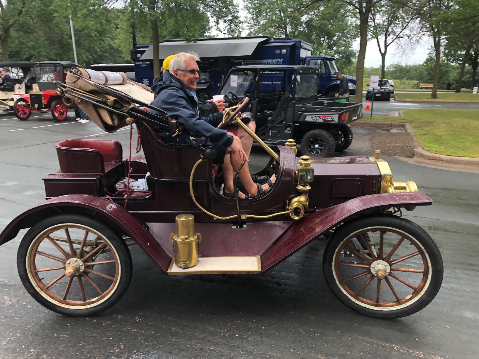 I drove it in my Curved Dash Oldsmobile. The usual great organization, support from police, and enthusiasm from bystanders. A wonderful assortment of early cars. The rain wasn't quite biblical, but it seemed that way sometimes. I didn't get to a hot shower until 9:30 pm. When I finally got undressed, I found a tiny duckling swimming in my belly button. Yes, it was wet!