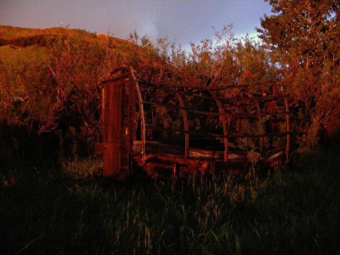 For you city folks and easterners, that is an old Sheep Wagon. The herders would live in it and move from place to place as the sheep grazed. I've had this one for years, parked it down by the creek for no reason other than it looked good sitting there. It is larger than most and probably was a "summer wagon" for herders that had a wife and kids. It is about 3 feet longer than the standard ones. Room for another small bed or two for the kids and a little more living room.
