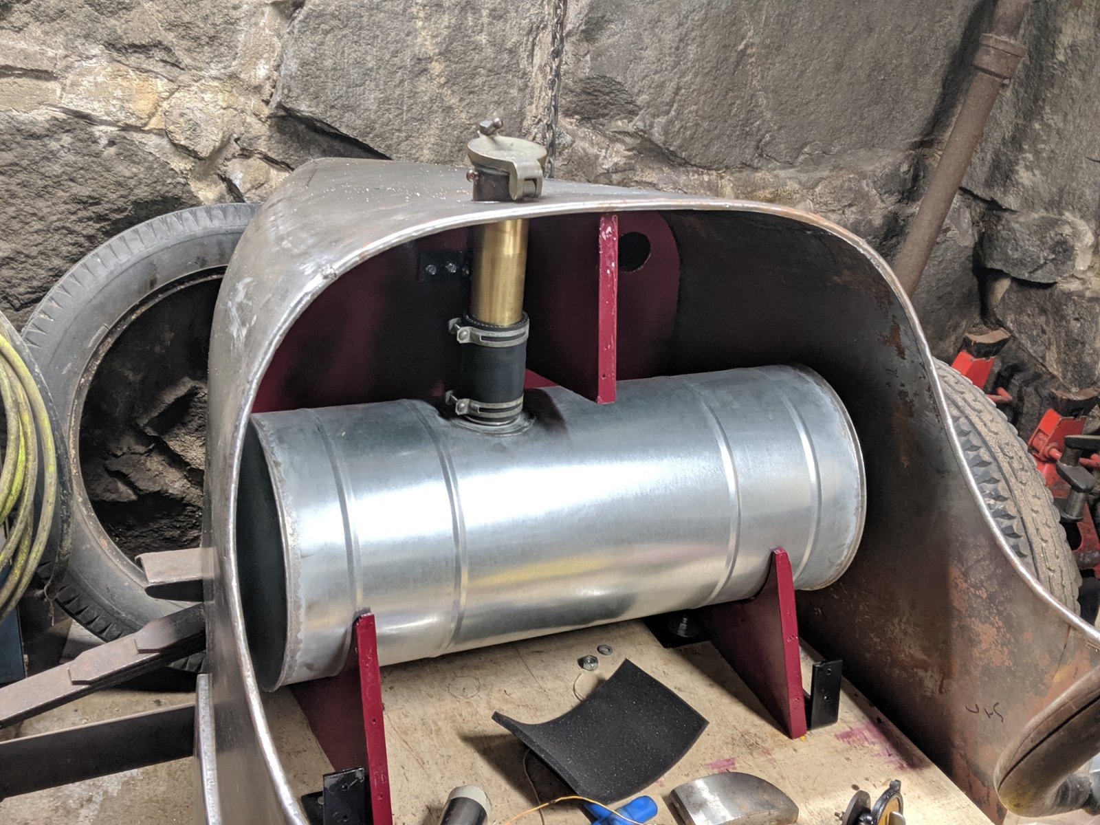 I then began working on the fuel system. The gentleman who builds the reproduction T tanks made me a custom one which is 3" narrower and sits behind the seat nicely. I then got a fuel fill adapter which threads into the tank, a fuel coupling, some t radiator hose clamps, a brass pipe, and a cool old brass flip top filler and created the filler neck. I used a harbor freight hydraulic knock out punch to put a perfectly round hole in the body. I also soldered the filler cap on because the tank will be pressurized.