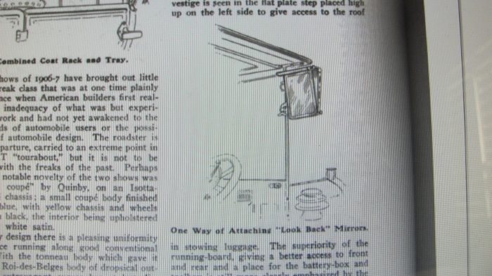 R.V. I have a question that you would know about. Was there a open car side mirrow made in the T era? If there was I dont think I’ve seen one and I don’t think Ford made one. I certainly could be wrong. Maybe one for the top of the windshield but not for the side.