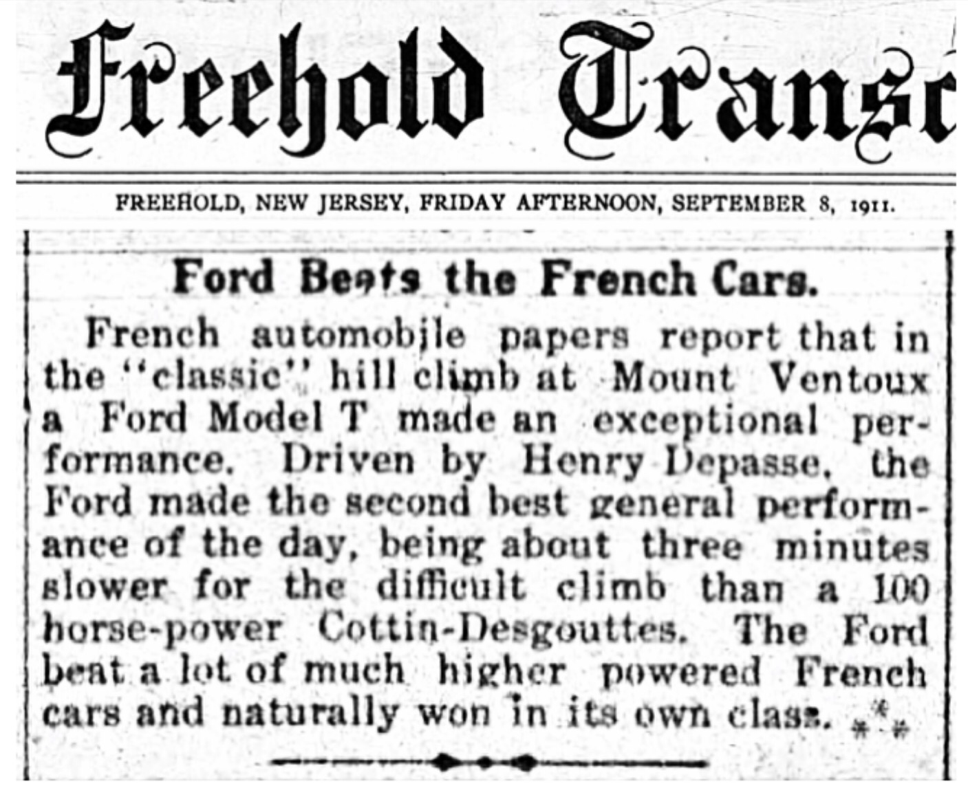 Undeterred by his failure to gain entry into the light car race, Henry Depasse and his Ford Special were still entered in the main event, the French Grand Prix. The race was scheduled for the 23rd of July. This note ran in the Tacoma (WA) Times, mis-stating that Kulick was the driver scheduled to race the Ford in the French race. Ford was the only U.S. automaker to enter the well known event: