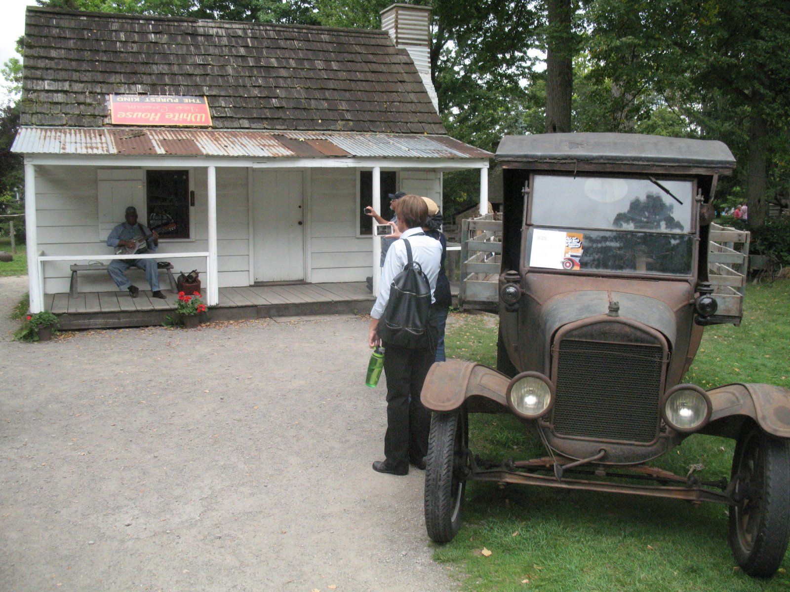 Sometimes it's impossible to get far enough away from the subject to "get it all in". You can take two or more overlapping shots and use Photostitch or a similar program to combine them into one. The first view of New Salem, the interior of Dr. Allen's house, and the big wheel at the carding mill are all Photostitched.