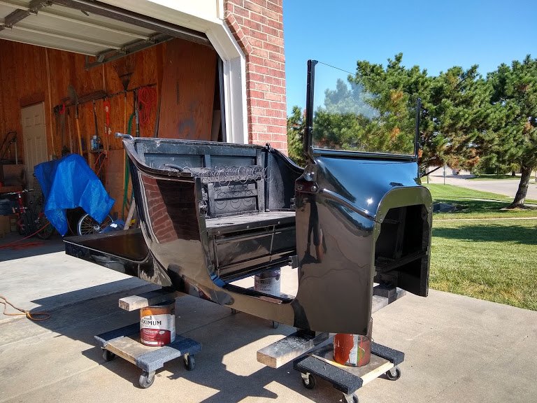 2) Set realistic expectations before starting. We’d all love to have a perfect paint job. Maybe that’s realistic if we’re also willing to take it to a professional and pay a lot of money. My expectations were twofold. First, I wanted a nice paint job that no one would notice. I think it is human nature to notice obvious flaws more than to notice something outstanding. If the paint job looked good enough to go with the new upholstery, top, radiator and wheels, then that would be good enough for me. My 2nd expectation was achieving a paint job that was nice as is on our touring car. It is well done, older restoration that I suspect has enamel paint. The paint job looks nice, but there are a few flaws if you know where to look from them. More than once I would use that paint job as a gage for determining if what I was doing was good enough. Last night when one of my sons looked the body, he said that it looked better than our other T. I think he’s right!