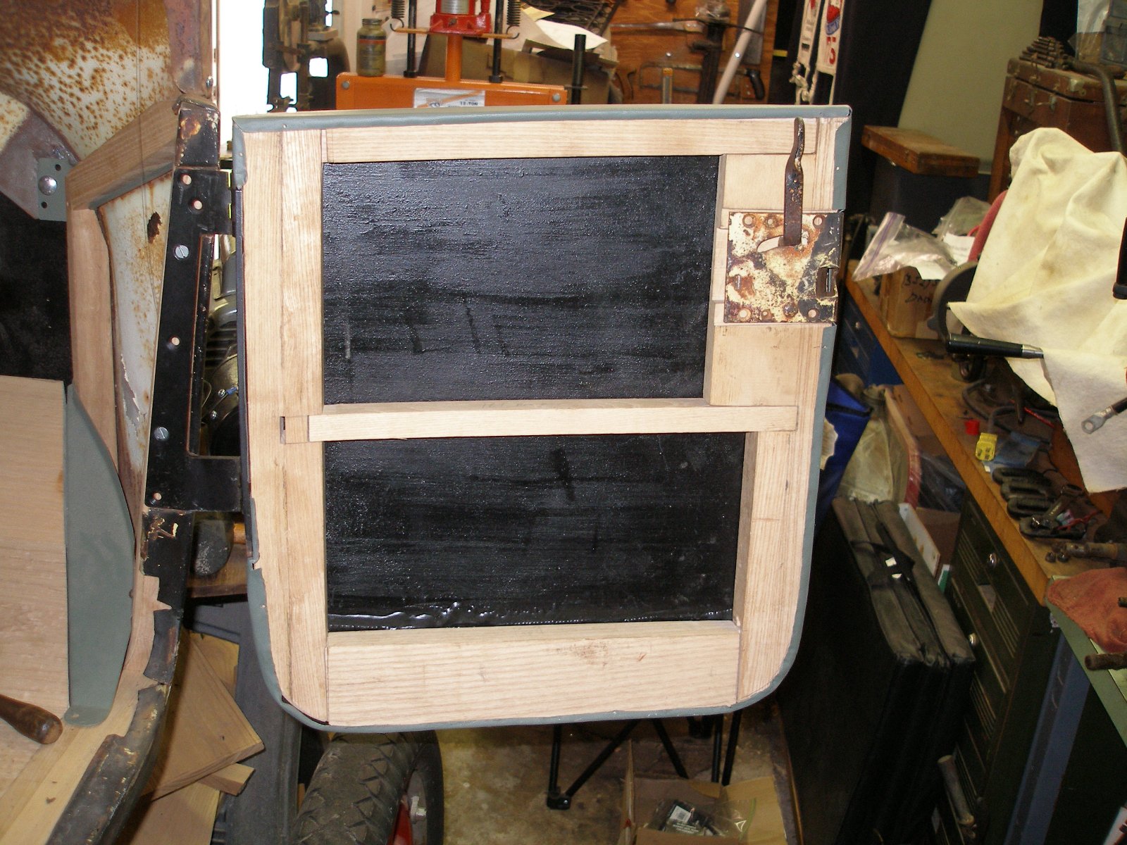 I re-wooded the body, using both wood plans and what remained of the original wood as patterns. It seemed to come out strong and straight. The plans I had did not include the door wood. But the door I got from Dan H had some wood somebody years before had started to make, and the '14 door I bought had nearly all its original wood. Some copying, some my own finagling, I re-wooded the door.