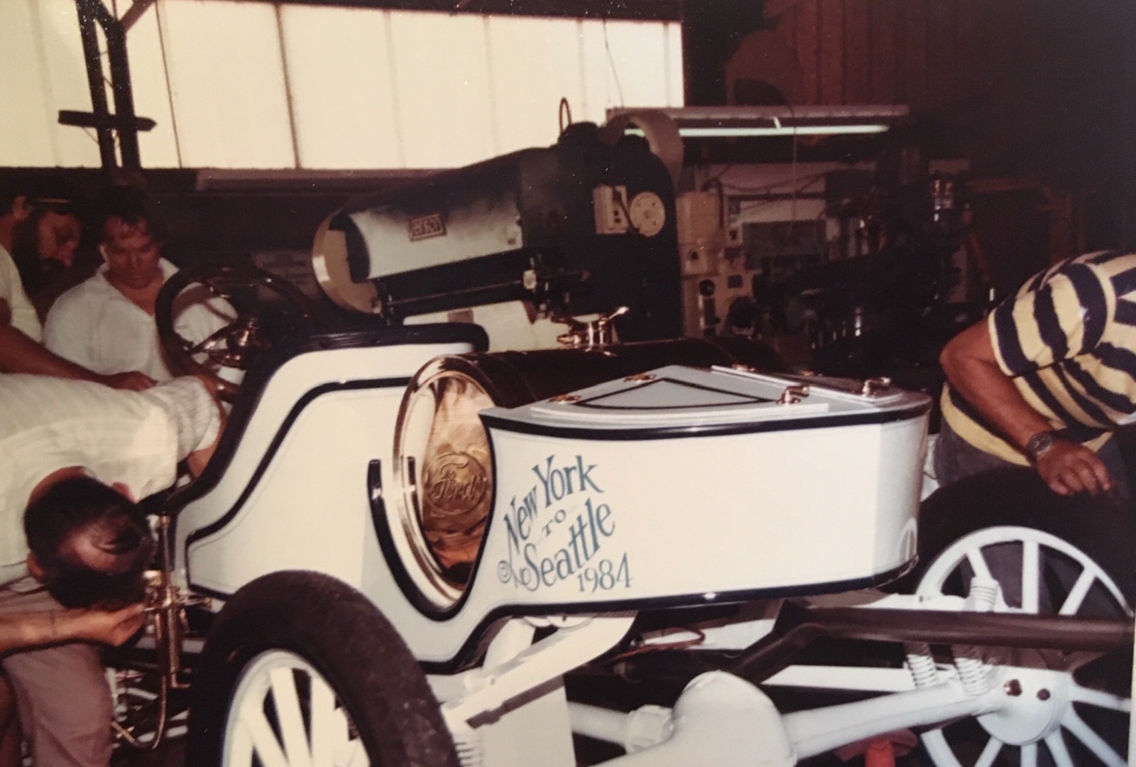 Then with a week to go we started to assemble the car. Everything went pretty smooth and I’m sure there were hiccups that I don’t remember. Oh- one. The cyl head was no good and had to be changed at the last minute. And lots of little things had to be adjusted, reworked or fabricated. But with so many hands it made it much easier. So we fired the engine the night before we were to leave. Cyl. head leaking. Luckily I had another low head, so we switched it out. Ran fine. Adjusted the bands. Backed it into the street and went down the block and back. Everything works. Put a skid under the car and lifted it up, took the wheels off and loaded it into the back of the pickup, covered it up, went home and slept for 4 hrs. and left for New York the next morning.