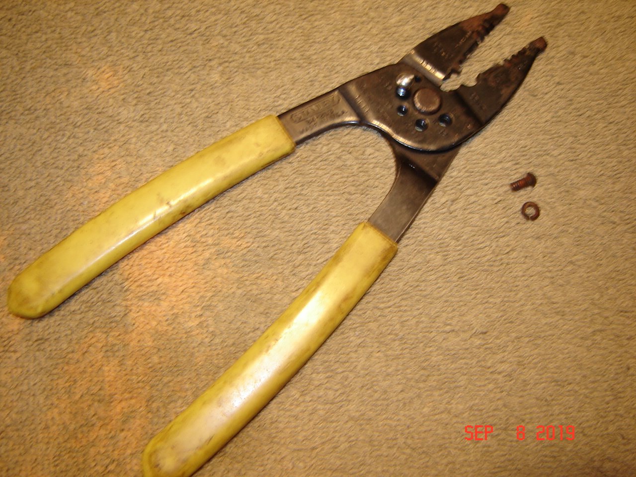 The proper screw to use for the ignition switch is #6-32. The original screws have 5/16 inch of threads on #6-32 round head screws with small split lock washers. If the screws are too long they will prevent the springy contacts from going into the depressions in the fiber back plate inside the switch. If you have a crimping tool for electrical terminals like the one shown, you can easily trim the screws to the right length without damaging the threads.
