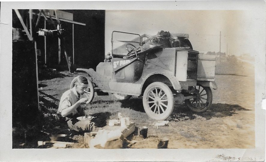 Here's my grandfather, Ben Ostergren Sr. having breaksfast in a farmer's yard near Rockford, IL on Sept. 14, 1916