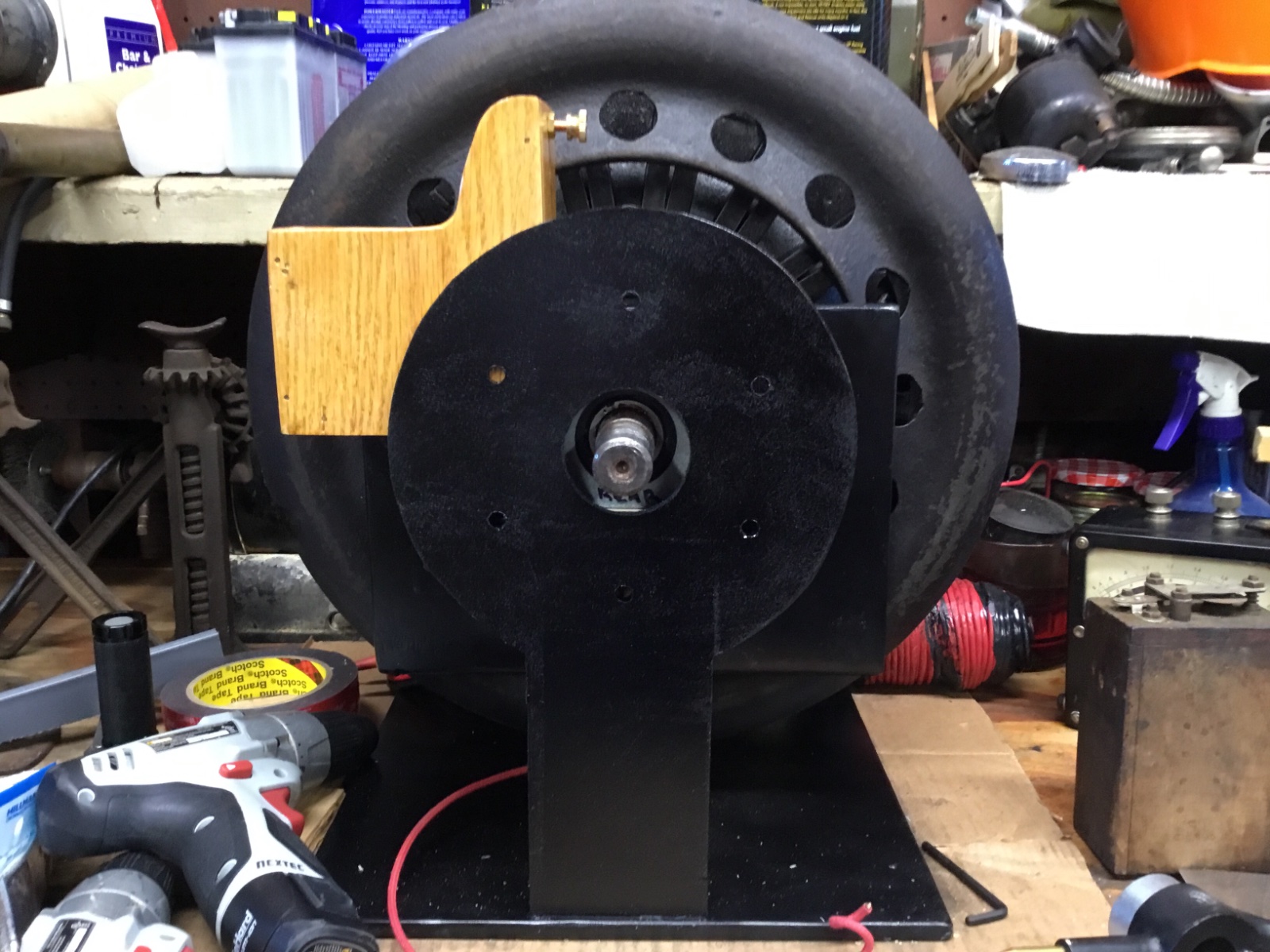 Starting to get an idea of what this is going to look like. Today I mounted the big parts, flywheel and field coil, and am still working on alignment. As a side note, if you’ve never lifted one, these things are heavy, so final assembly will happen on it’s work stand. I’m not sure where the meters will end up, but the photo shows one possible location. None of the wooden parts are permanently installed yet.