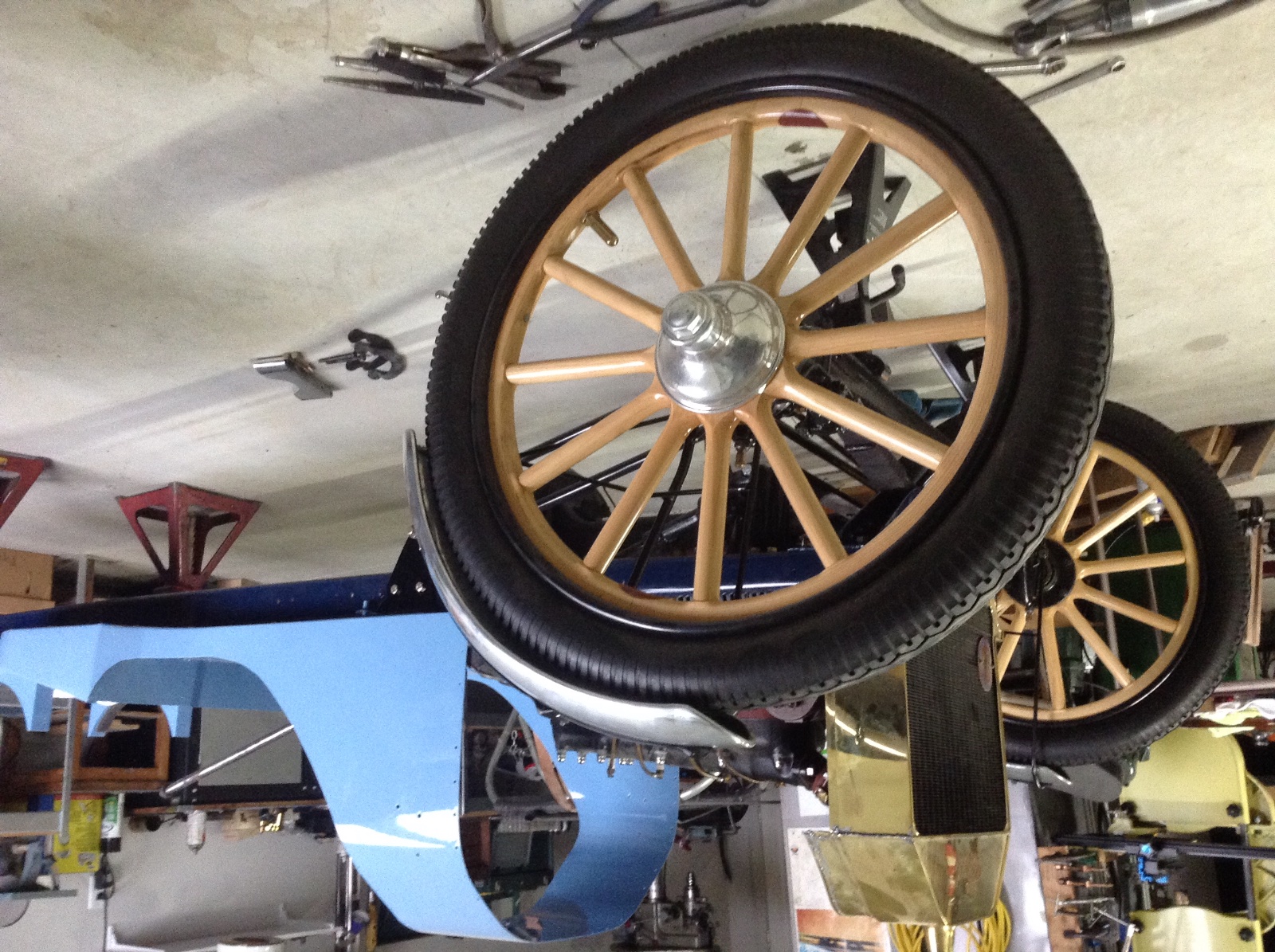 Front end coming together head lamps installed. Bought these off e bay from a vender in Quebec because they were aluminum ,which goes with the aluminum cycle fenders and hub caps etc.when they arrived there was AL cast into the top a quick Google search and these lamps are from a 1907 AL car built in France.