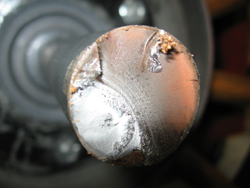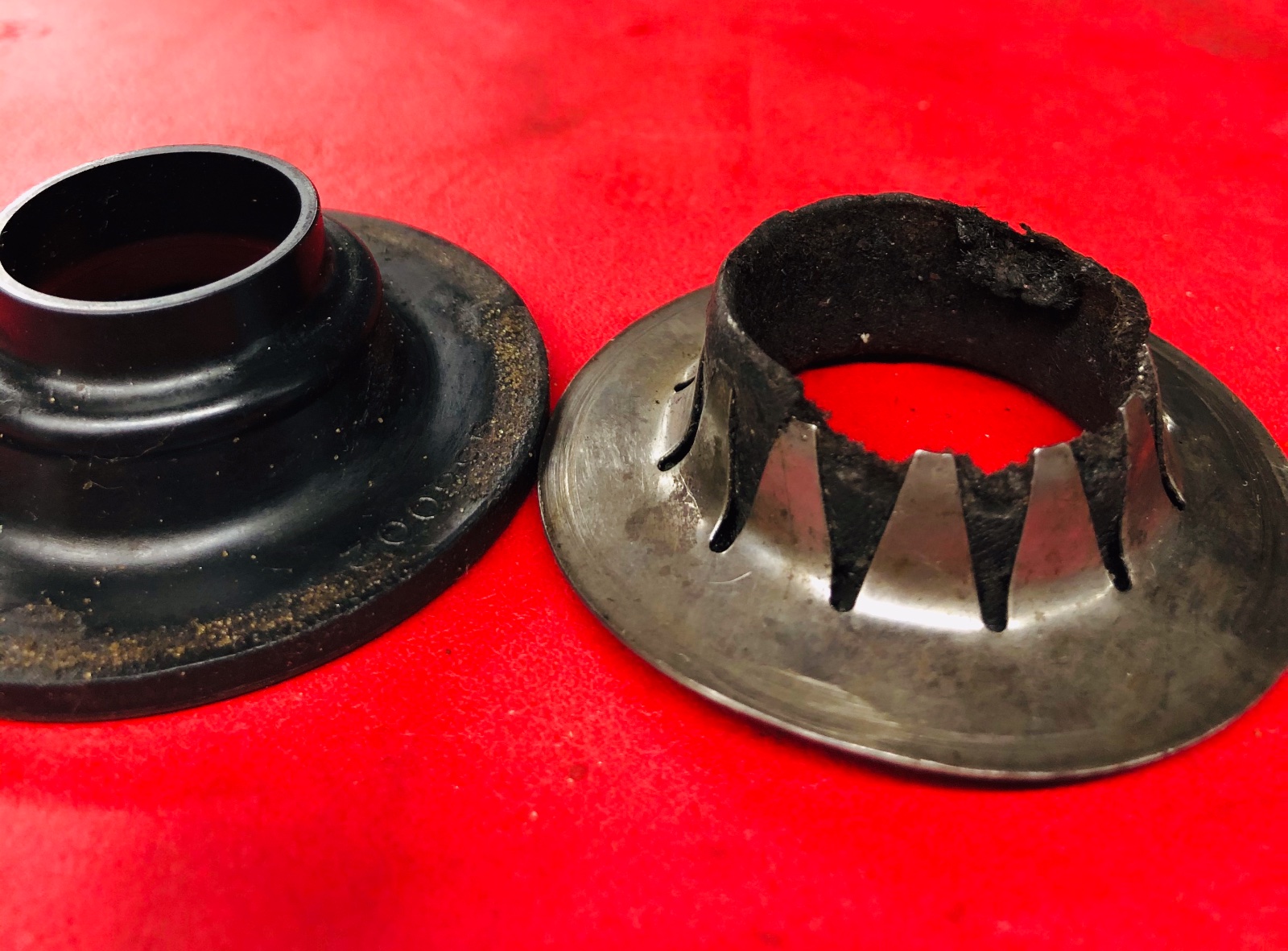 As for the hardened spring toothed washer of the Ford design, note this one on the right. Pulled from rear end, and the leather boot is almost worn gone, and you can clearly see how the hardened teeth of the Ford late design can rub and wreck a good axle shaft. :(