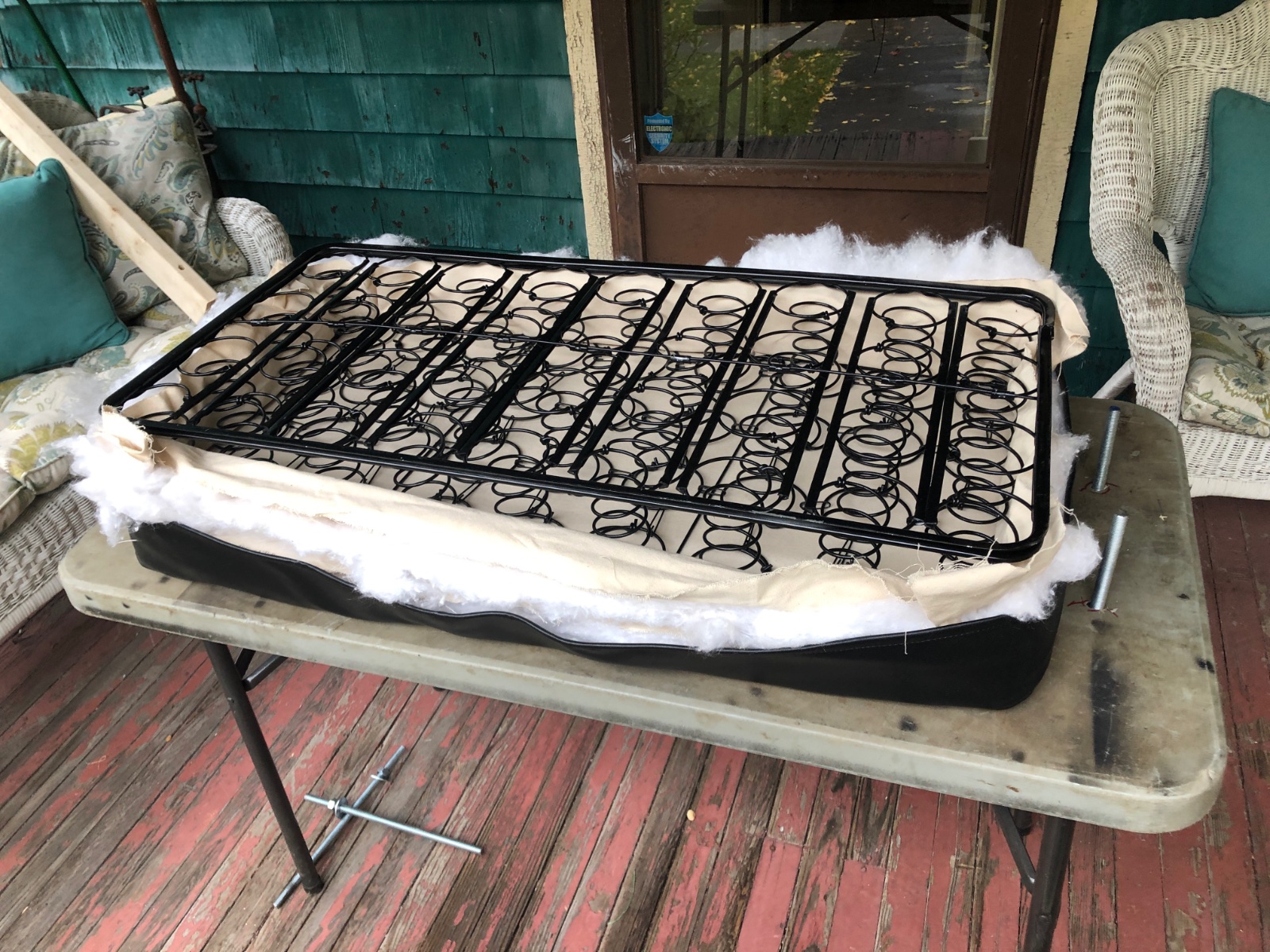 Just thinking aloud for myself after seeing this process: Perhaps some store-string and a large eyed leather needle could fasten the canvas to the top of the spring in a long loop around, satisfy folk (I get both sides and understand but we can’t quite run the new material with the canvas thru the sewing machine again, can we?) and then the folded canvas skirts on the bottom could be secured at the bottom by more string to keep the canvas in place and the new material away from ever getting into the springs?