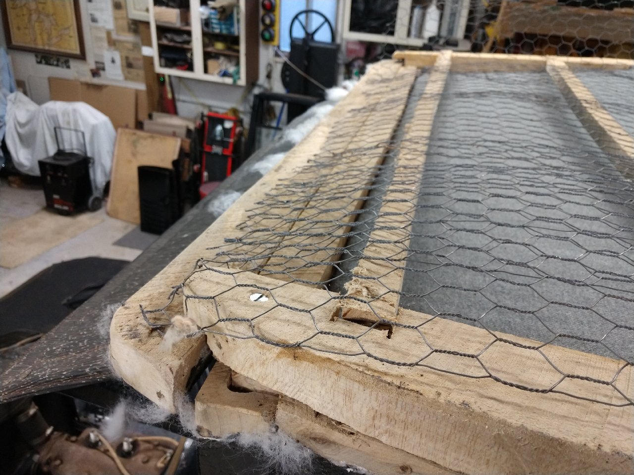 More pic's... This car was originally from the Upper Peninsula where you look up to see how deep the snow is. I was a bit surprised to find rolled roofing under the top pad. The weight of the roofing material took a toll on the top bows. Just part of the fun … Notice the prior stapled the chicken wire and screwed the headliner hangers. yeeee ok~