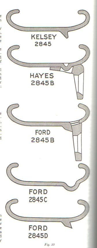 If rims/wheels are intermixed, this wedging effect must be part of the fit. Any combination which achieves the wedge and does not rely on just the 4 bolts should be satisfactory. In any case Hayes rims are the least likely to fit because of the need for a relief in the felloe needed for the foot on the lug. Which brings me to Chev rims, invariably made by Hayes. These are wider than T rims by 3/16" to 1/4". When the valve stem hole is drilled to suit Hayes made Ford wheels, they will bolt up to fixed lug type felloes, will wedge on the inner rolled edge on the felloe, but the lugs will stand further off the outside of the felloe, reflecting the fact that the rims are wider.