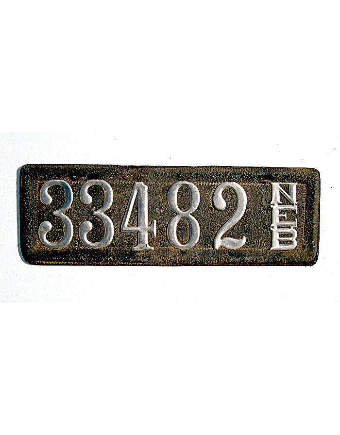 From June 1905 through 1914, a Nebraska car owner had to display the registration number assigned to him by the Secretary of State on the back of the vehicle. The numbers had to be at least three inches in height and each "stroke" of the number at least a half an inch wide. "NEB" with each letter at least two inches in height was also required to be displayed on the back of the car.