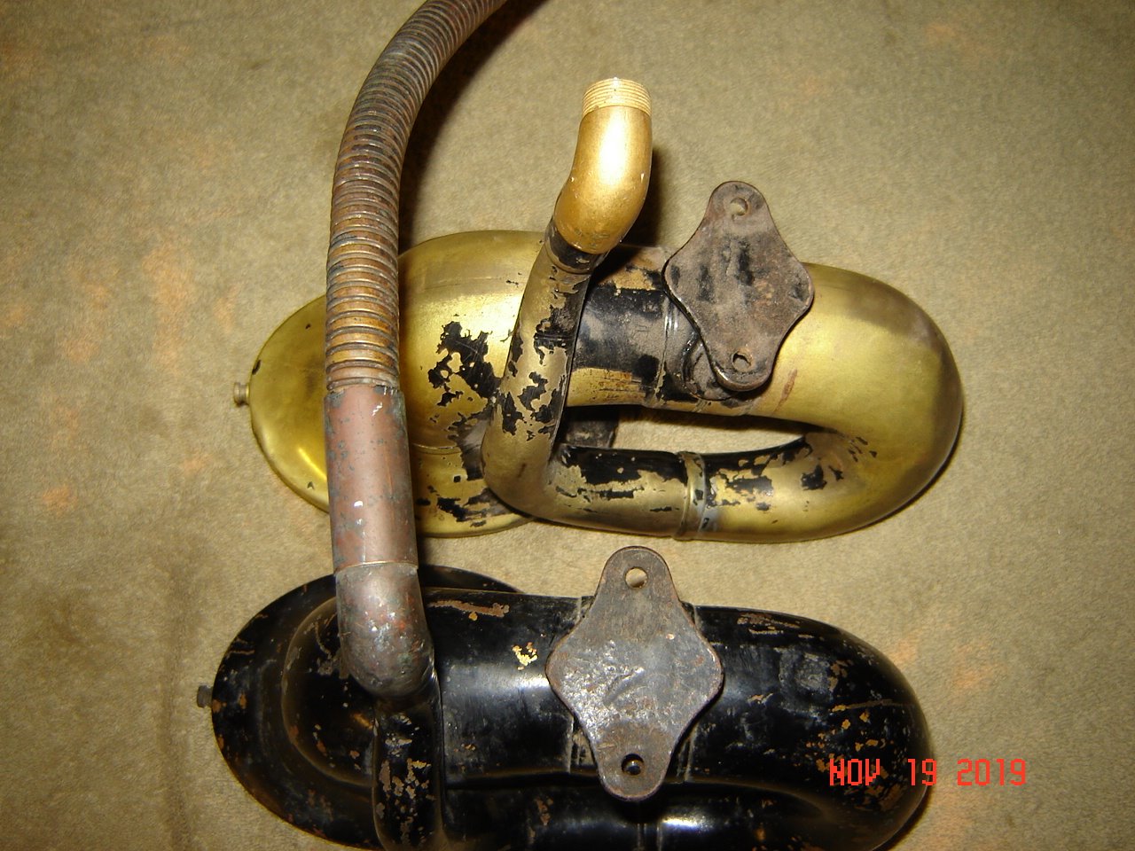 Here are some pictures. You can see the scalloped mounting bracket, also the 90 degree elbow that screws on instead of the straight tube used previously. The 1915 bracket is different than previous years as well. There is a brass tube not pictured that covers the reed and holds the bulb.