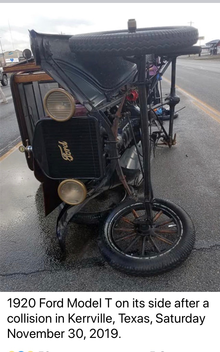 There was a collision during a Ford Model T tour in Kerrville, Texas, yesterday, Saturday November 30, 2019. A 1920 Ford Model T Center Door and an approximately 10 year old Plymouth PT Cruiser made contact at around 10 AM on a four lane road with both a center strip and hard shoulders, on the main road out of town heading towards Ingram. The road was busy but dry and there was unlimited visibility. The PT Cruiser remained upright and stopped on the right shoulder after a short distance, The passenger side rear wheel of the T was most likely the point of contact. It shattered from the impact and the T became uncontrollable. It ended up in the center strip laying on the passenger side. The sole occupant, Jerry King, was able to get out of the vehicle unaided. He sustained injuries that caused him to be taken to the nearest hospital. Numerous EMTs, fire fighters and local police swiftly secured the scene and interviewed the drivers involved and witnesses. Jerry was released from the hospital in the evening.