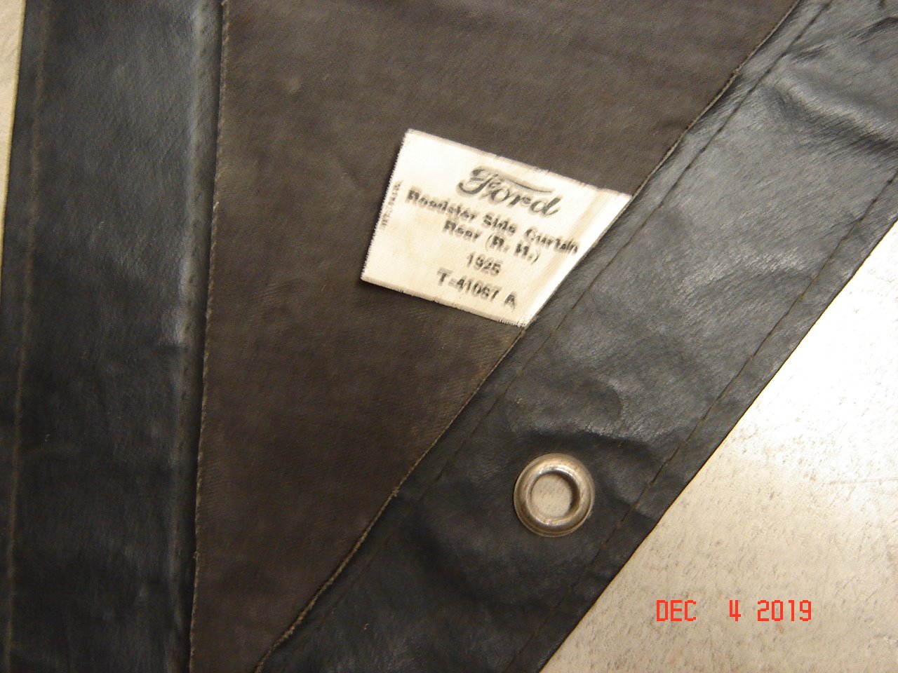 The attached pdf file contains sketch/ with dimensions, of the curtains for the '26-'27 runabout made from original pieces. See the note that no flap on passenger side. And see photo of original curtain on passenger side, no flap, but as the curtains fit loose at the door , and there are no snaps on the lower edge of the curtain, easy to lift the lower curtain edge and grasp the door latch!