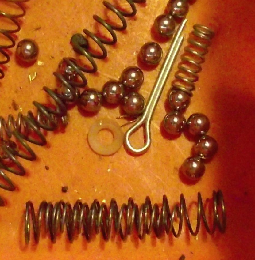 Now the tricky part, get a ball, the spring, another ball in the hole, seal it in and still have enough of it sticking out to contact the sides of the holder. Finally, take a 1/4 x 32 die and run it down the threads and a 1/4 x 32 tap and run it through the threads in the holder and it should be good to go.