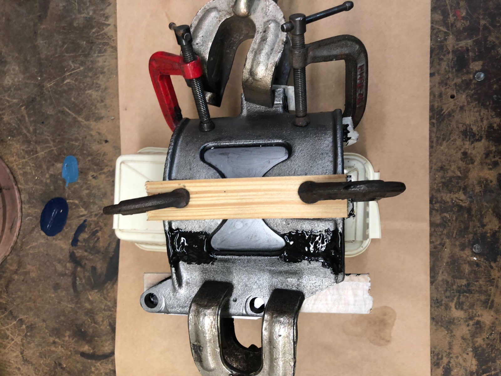 Some added repairs. This Epoxy is for panel attachment in modern vehicles but man is it strong. I have fused items together that there really was not any other way. The lower mount had a bunch of micro fractures and she was welded before. I noticed little voids here and there so to support it, formed a piece of 1/16" steel plate and epoxied it on. I previously machined the case to accommodate the added dimensions.
