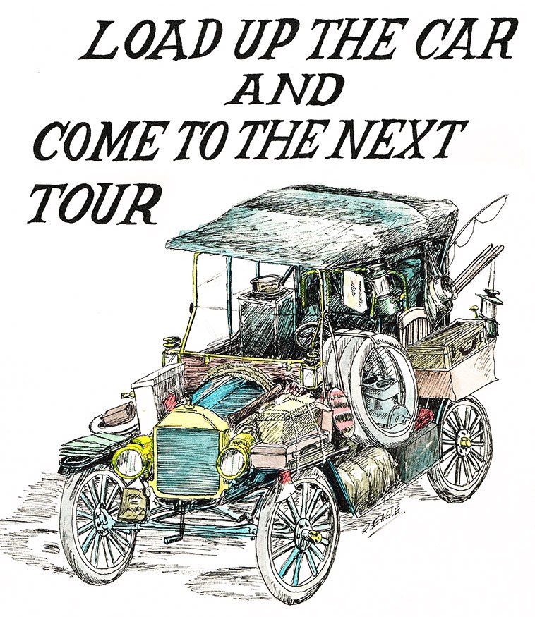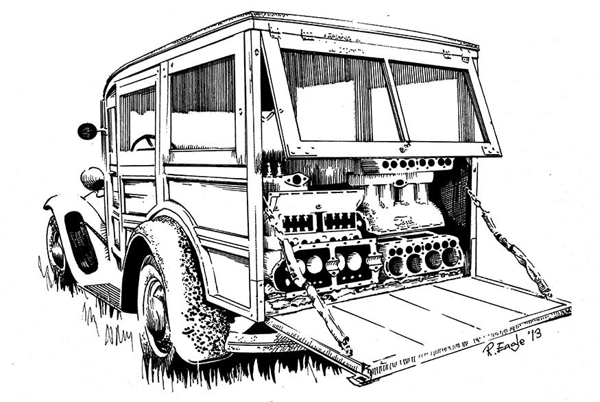 When I drew this for a local swap meet poster I was reminded that the wagon should sit much lower in back carrying that many Model T blocks.
