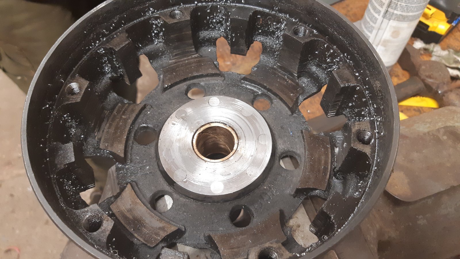 Hi, disassembling my broke transmission I discovered that the rivets in the brakedrum was loose. So I got a friend of mine experienced with both hot and cold rivetting as well as general machining to help me.
