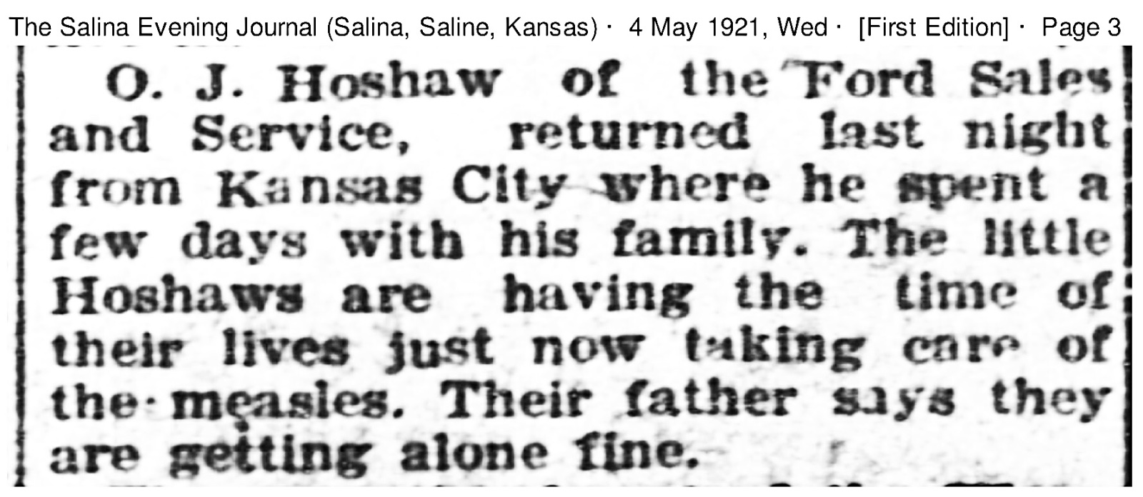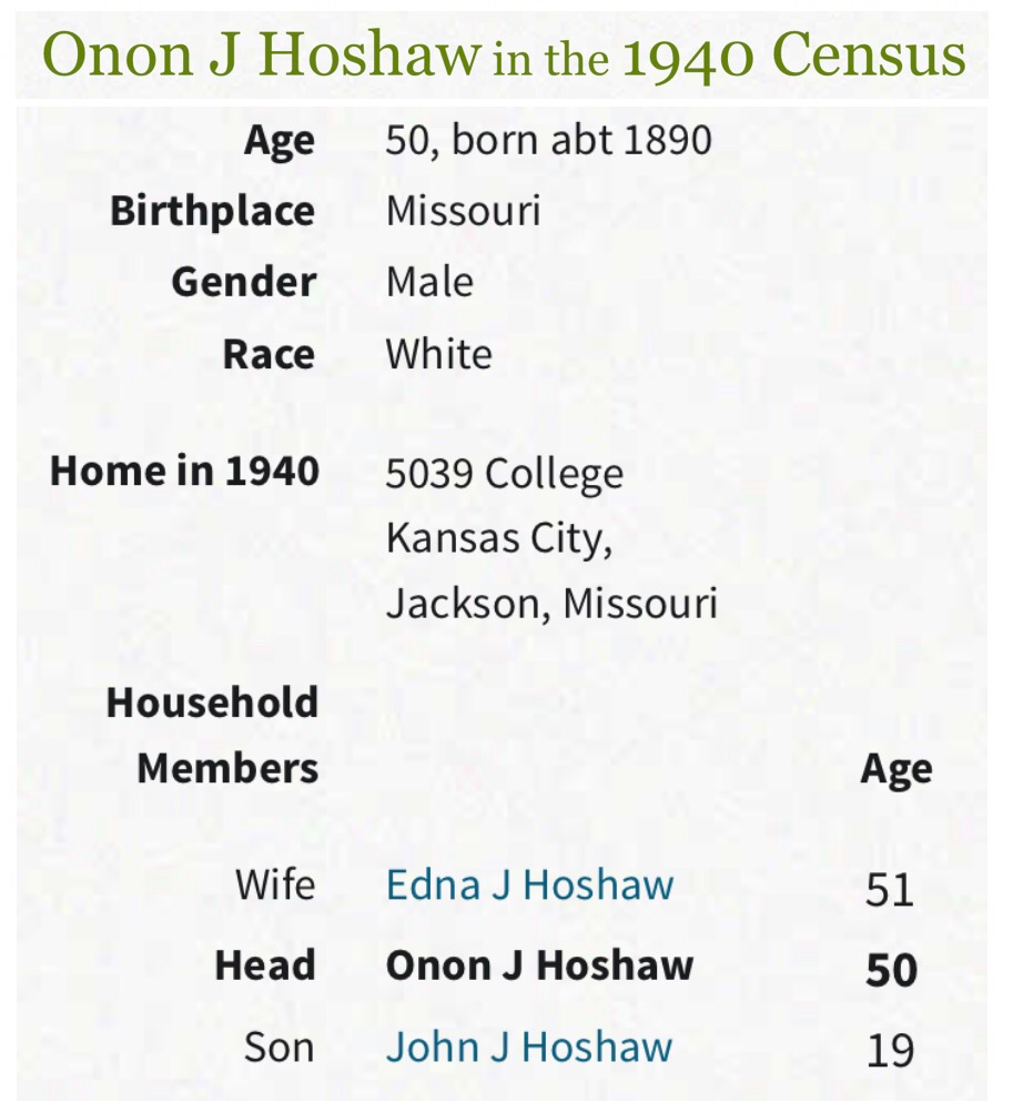 Onon J. Hoshaw was born in 1890, and worked for a Ford dealer(s) in the Kansas City and Salina KS. area. He would have been 17 years old when the 1907 K (manual) came out. Now the question is, did he or his family own a Model K? Or did he pick up an old manual as a Ford employee at some point. The state of Kansas was one of the most prolific areas for Model K, so who knows.