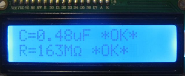 display.setCursor(0, 16); display.print(leak / 1000); display.println(F(" Kohm Ideal > 10M"));