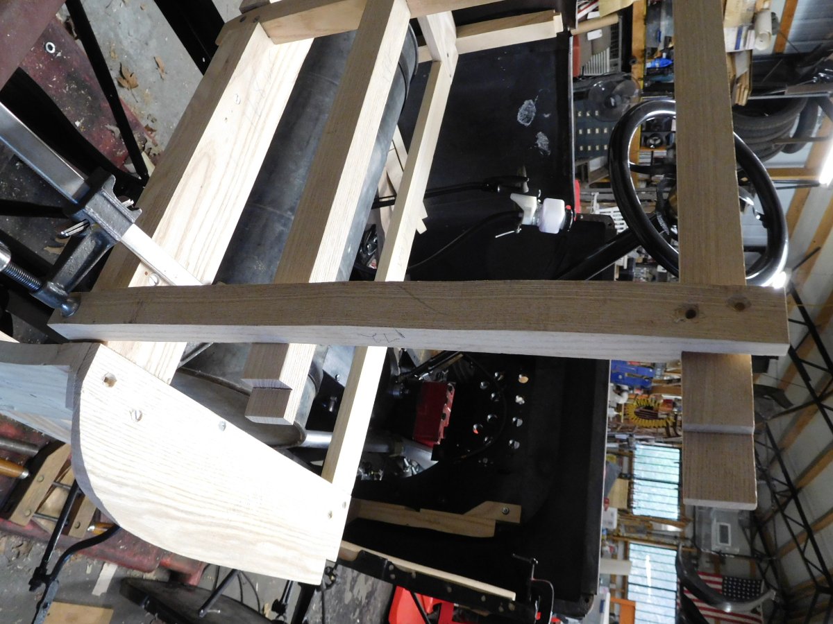 You are misunderstanding my semantics. The vertical (at least the far left/right) members must be to the passenger (originally stated "inboard") side, and the top horizontal board must be outboard or rearward, toward the sheet metal. This is what sets and creates the rigid foundation to the rear sheet metal. The little (approx) 1x1 strips are merely the tack strip for seat and top and provides little real support for sheet metal, and they are placed outside of the metal surface.