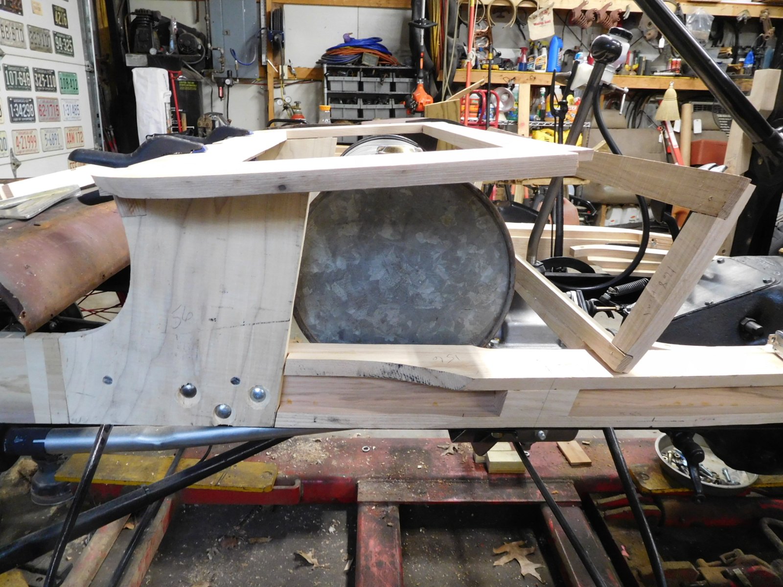 Should look like this. Note picture #3...I rejected this as an error as I removed material near the top which would have left a gap between the body and the trunk...this part got remade and I failed to take that picture...I did my own wood so had no one to blame but myself. You will be hanging metal countless times as things get adjusted. For those who notice, the drywall screws are for fixturing. I used flathead wood screws for final assembly. This is a '23 and I make no claims that your body will or should lay out like mine, though this should give you a clue as to what it should end up like: